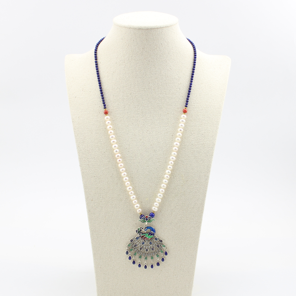 Enamel Sterling Silver Lapis Lazuli, Coral Freshwater Pearl Necklace 131553