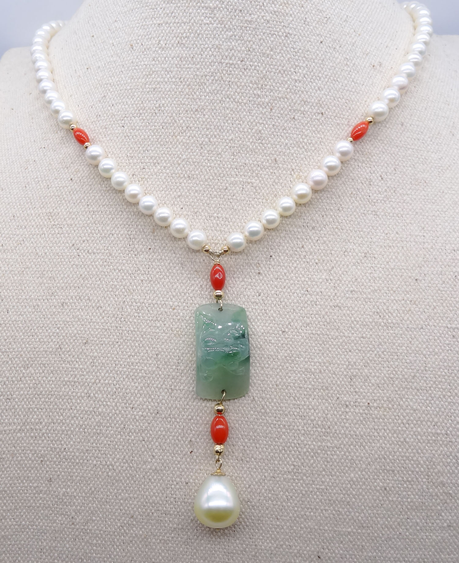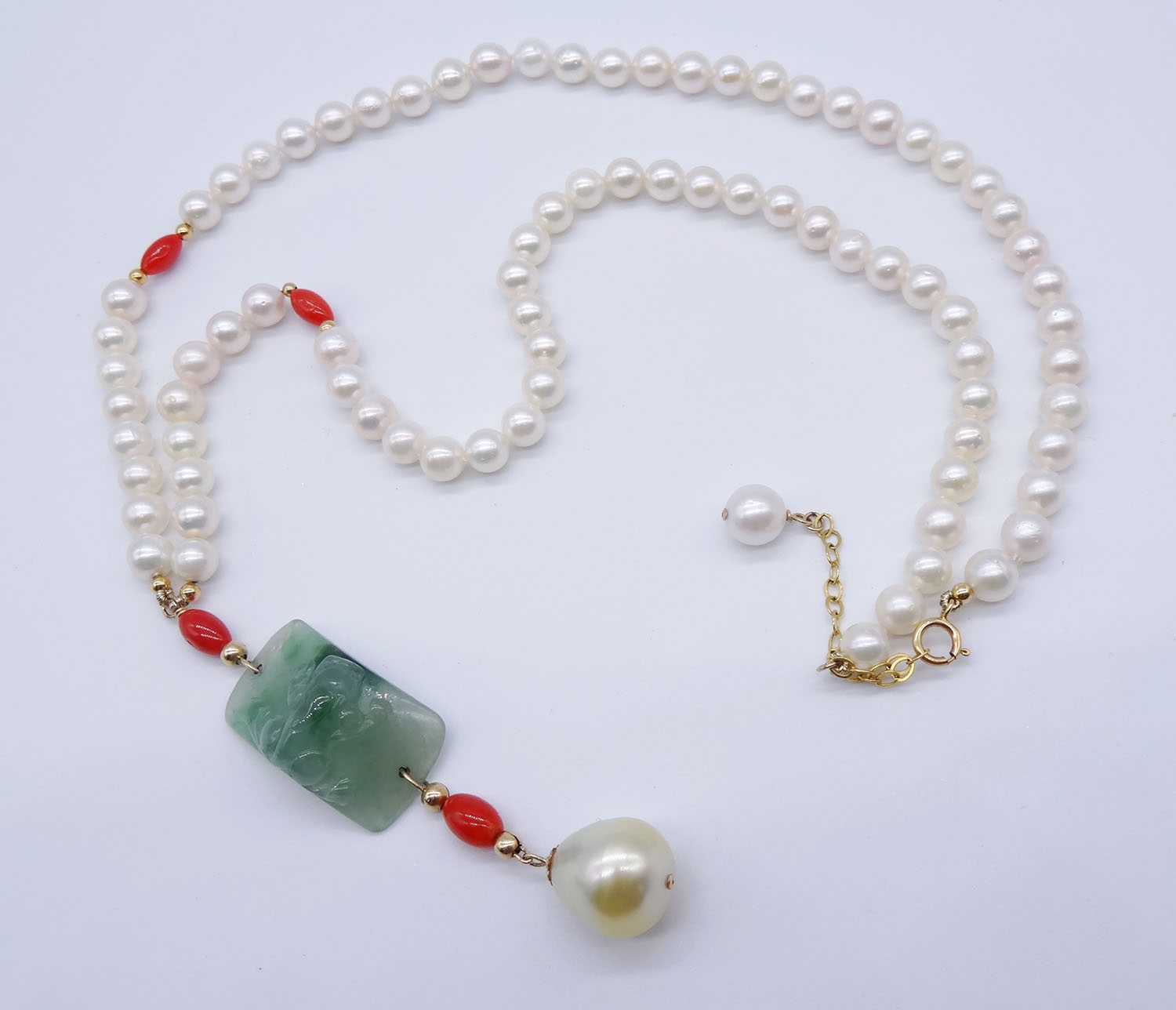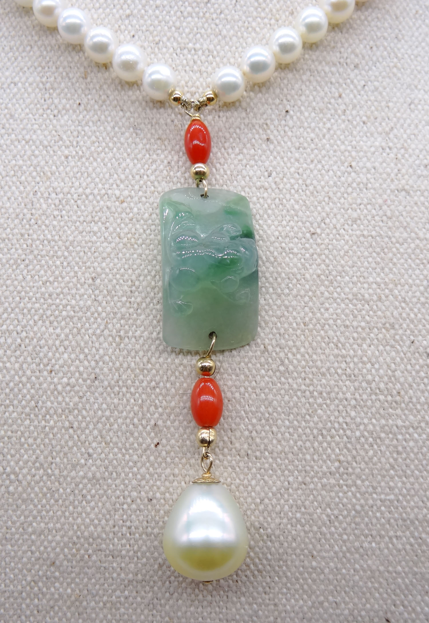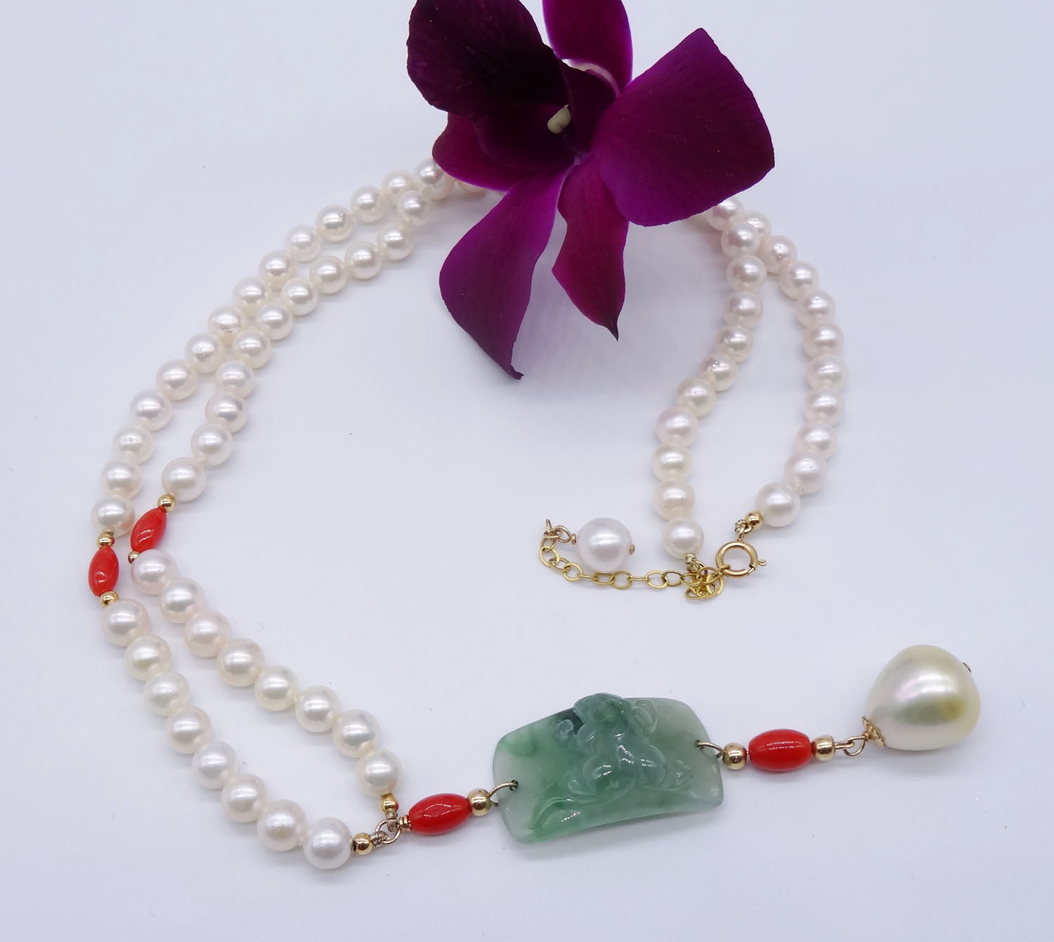 Solid 18k gold AKOYA pearl, jade, coral, and South Sea pearl necklace 170395
